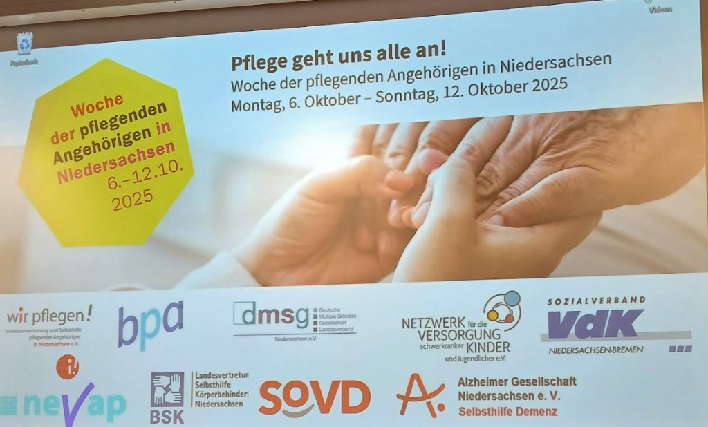 In diesem Jahr, vom 6. – 10. Oktober 2025, findet nun auch in Niedersachsen zum ersten Mal diese Woche der pflegenden Angehörigen statt. Am Montag den 6. Oktober war die Auftaktveranstaltung im Leibnizhaus in Hannover. Die Schirmherrschaft hat der Ministerpräsident Olaf Lies, der auch eine Videobotschaft übermittelte. Auch Filmteams vom NDR und von SAT1 waren anwesend und haben die Veranstaltung gefilmt und Beiträge darüber veröffentlicht.